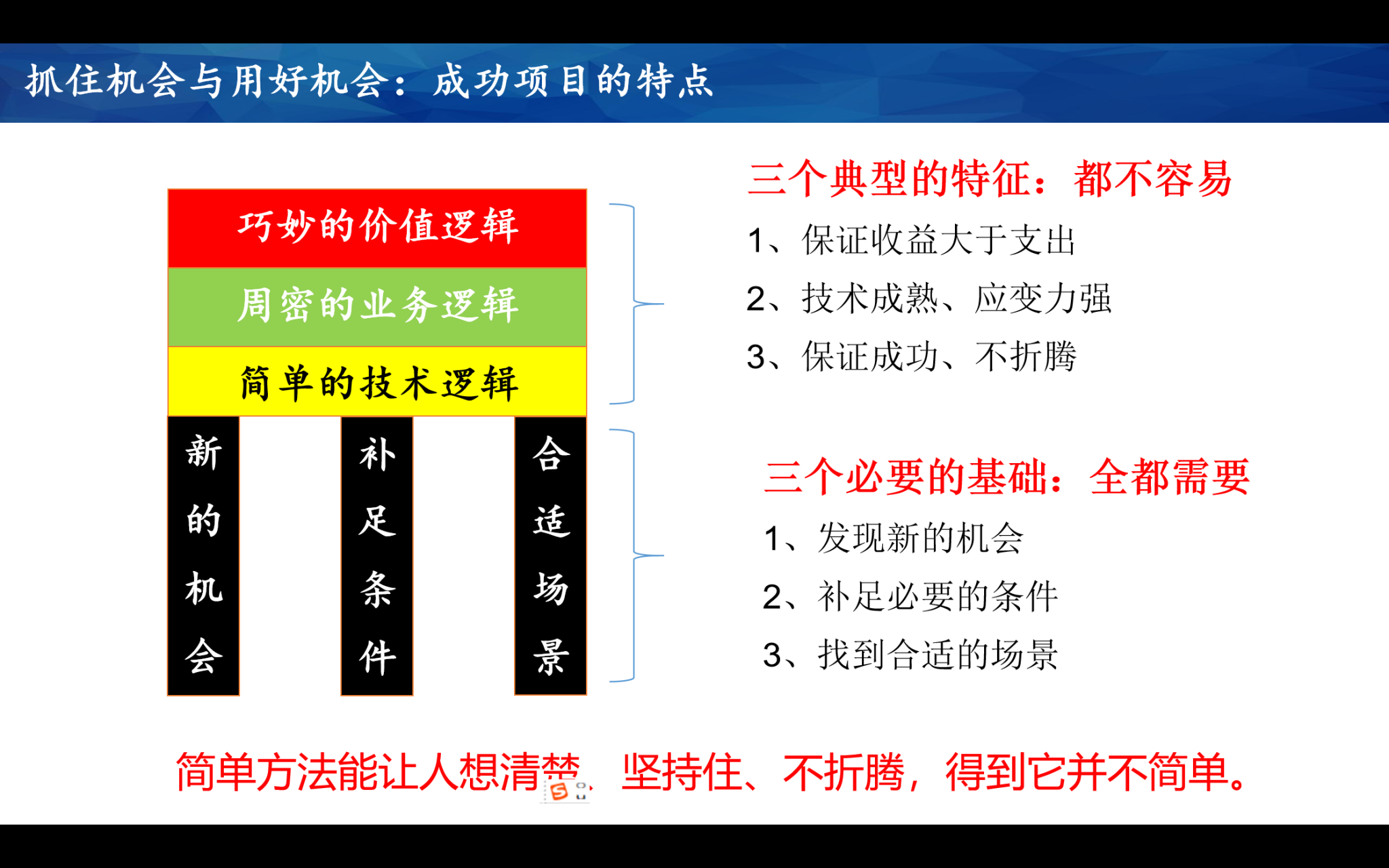 好的科技创新项目,往往有三个特点:简单的技术逻辑、周密的业务逻辑、巧妙的价值逻辑。要做到这三点,难在什么地方呢?首先是周密的价值逻辑。含长期、间接、潜在、随机价值。找到能够便于赚钱的场景;其次是周密的技术逻辑,要深刻地理解用户的场景、考虑到各种关键问题,开发技术时不要丢三落四。第三点是简单的技术逻辑。技术逻辑简单,但找到这样的技术逻辑并不简单啊!有了这个基础,才会有周密的技术逻辑,甚至才会有巧妙的价值逻辑。